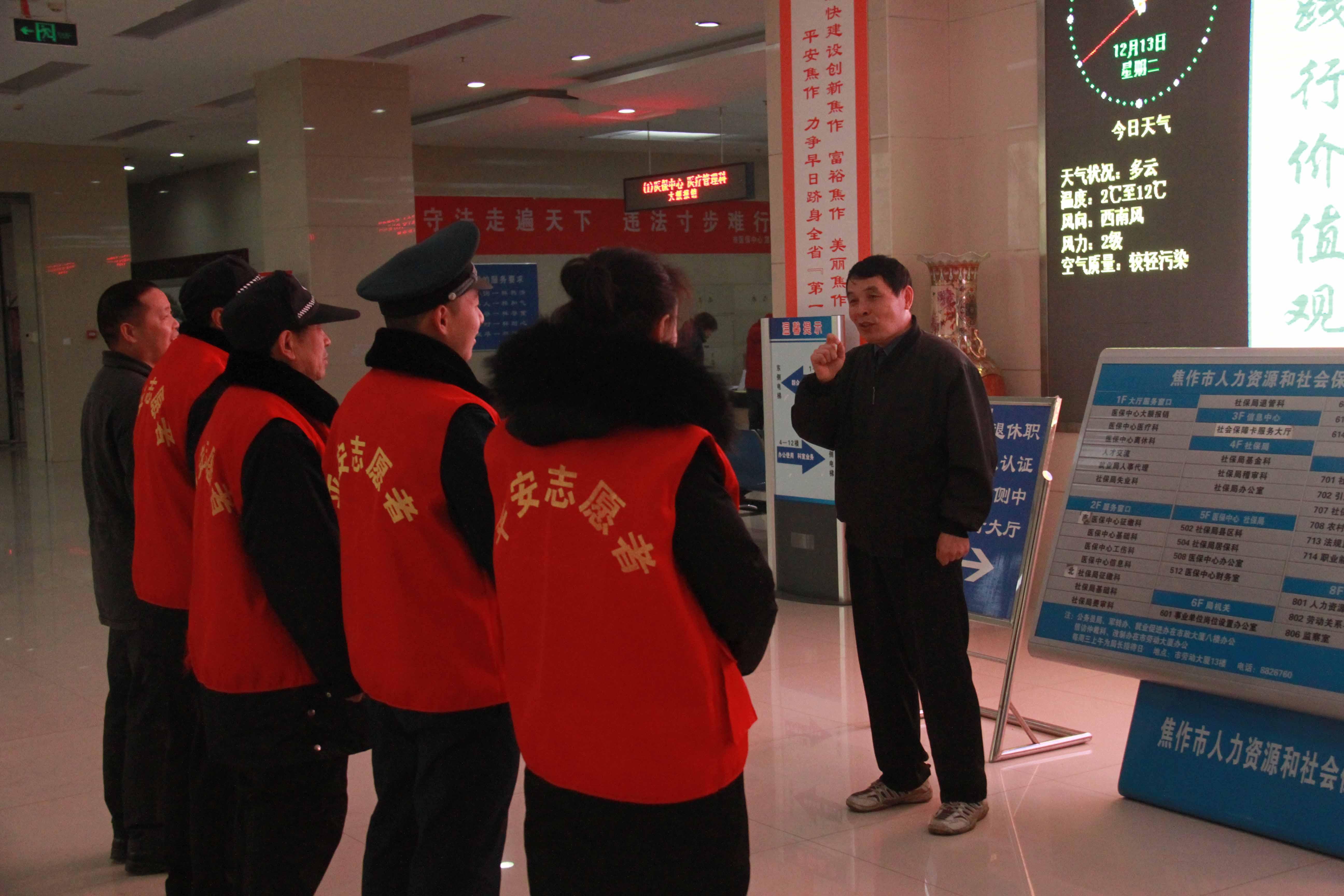 12月13日,在人社大厦社保服务大厅,几名平安志愿者穿上“红马甲”,正式上岗巡逻。一个个移动的“红马甲”不时映入人们的眼帘,恰似一道亮丽的风景线,令人眼前一亮。