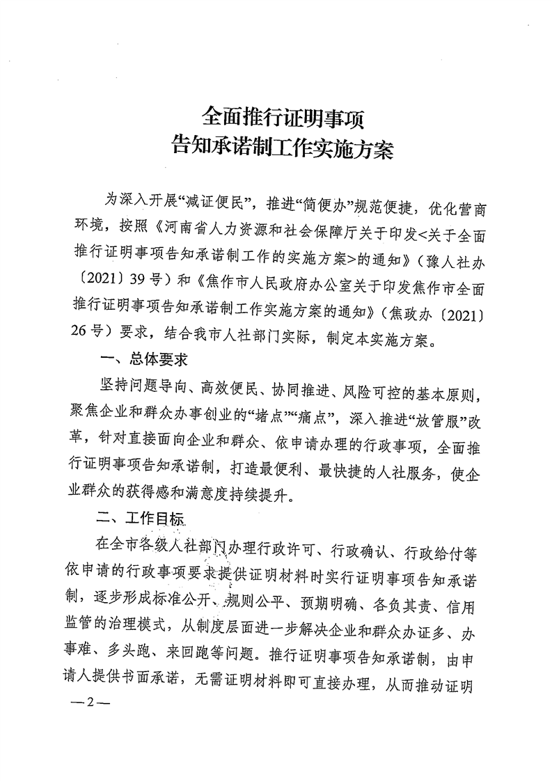 焦人社办〔2021〕12 号 全面推行证明事项告知承诺制工作实施方案