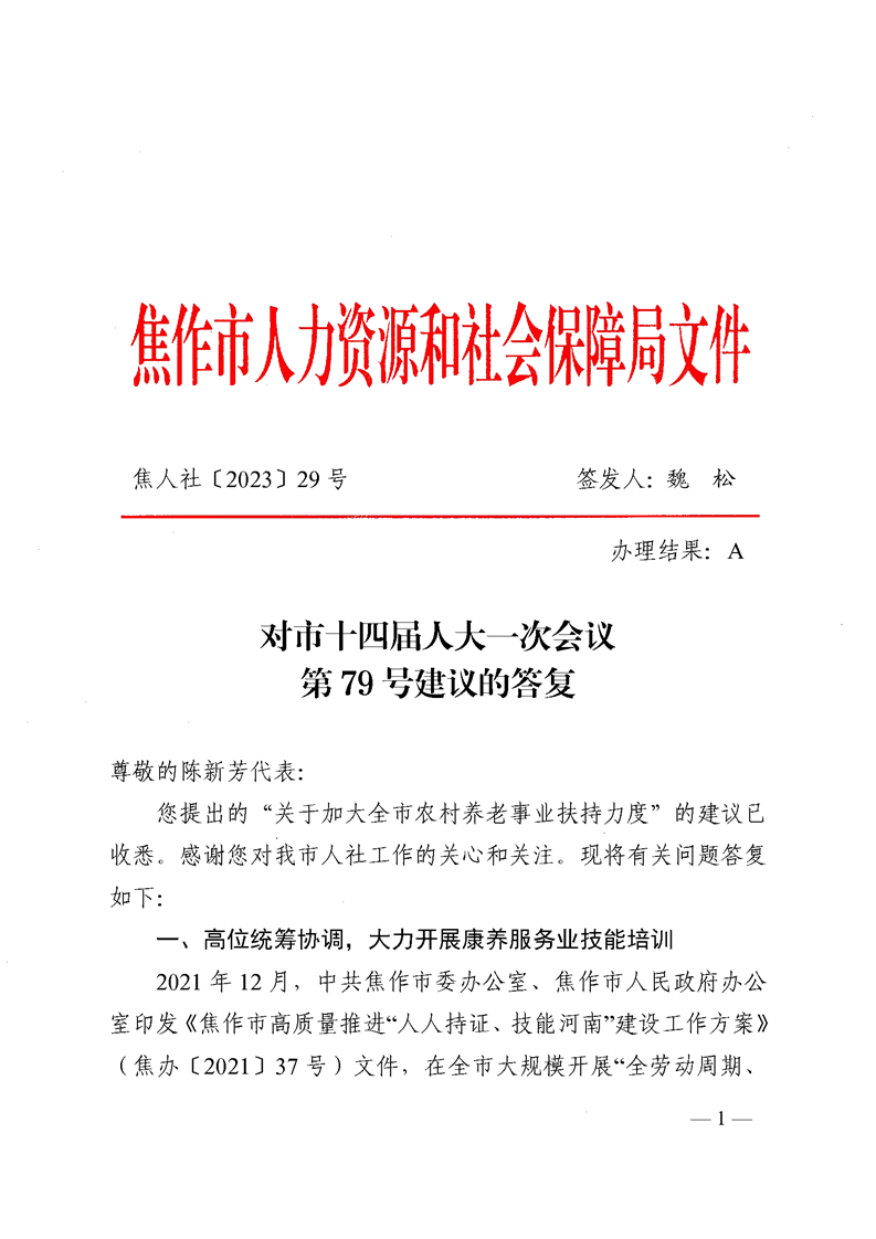 焦人社〔2023〕29号 对市十四届人大一次会议第79号建议的答复