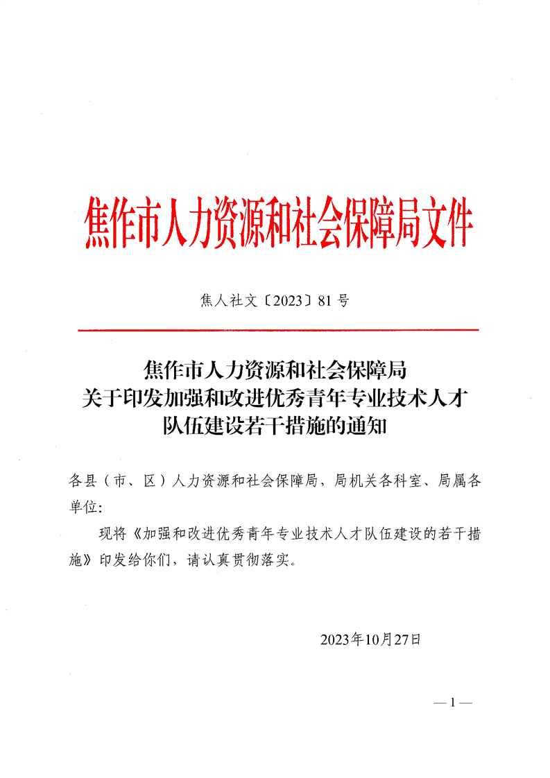 焦作市人力资源和社会保障局关于印发加强和改进优秀青年专业技术人才队伍建设若干措施的通知