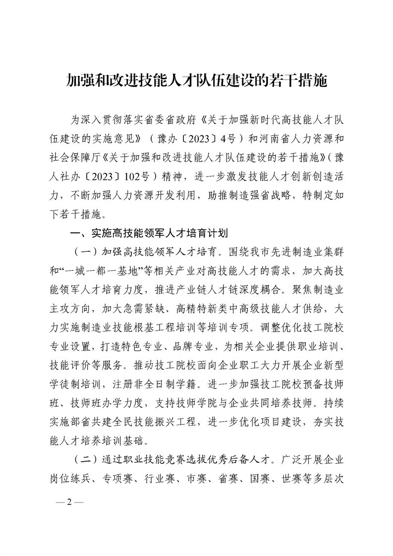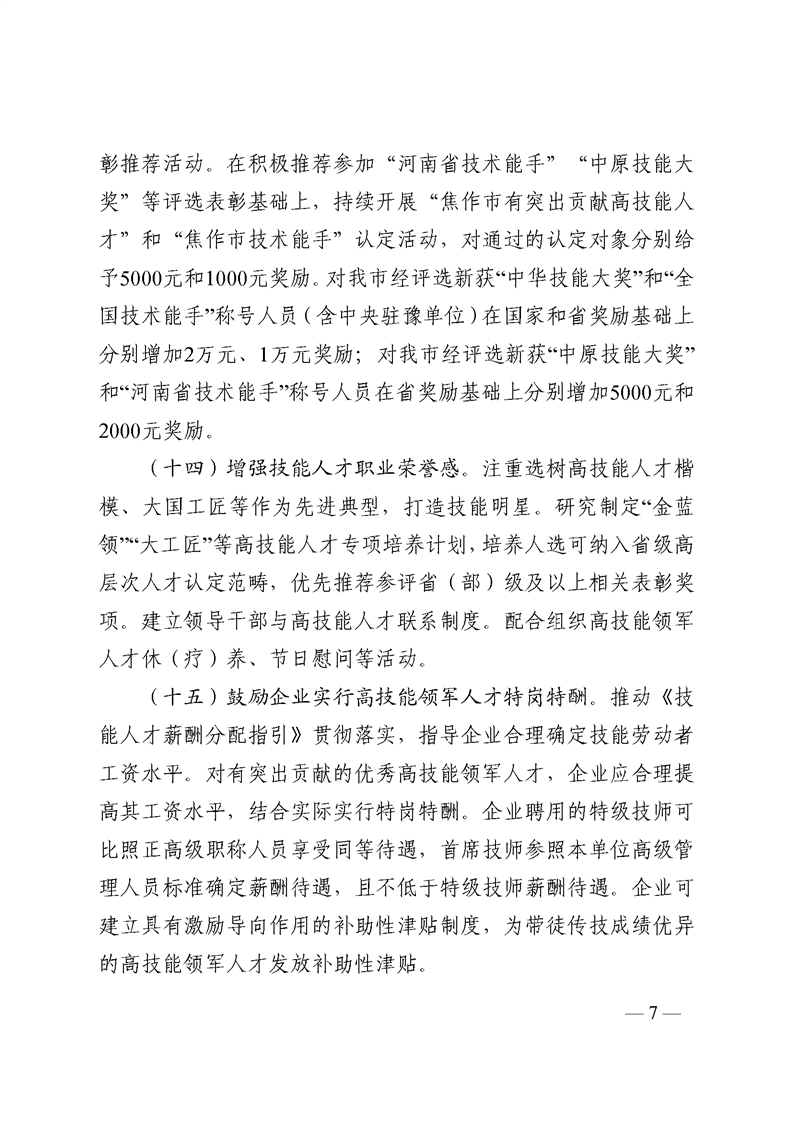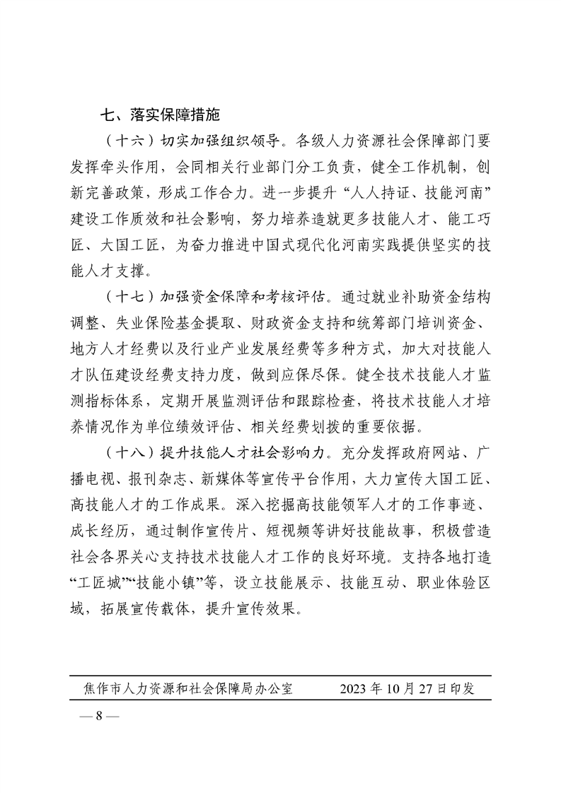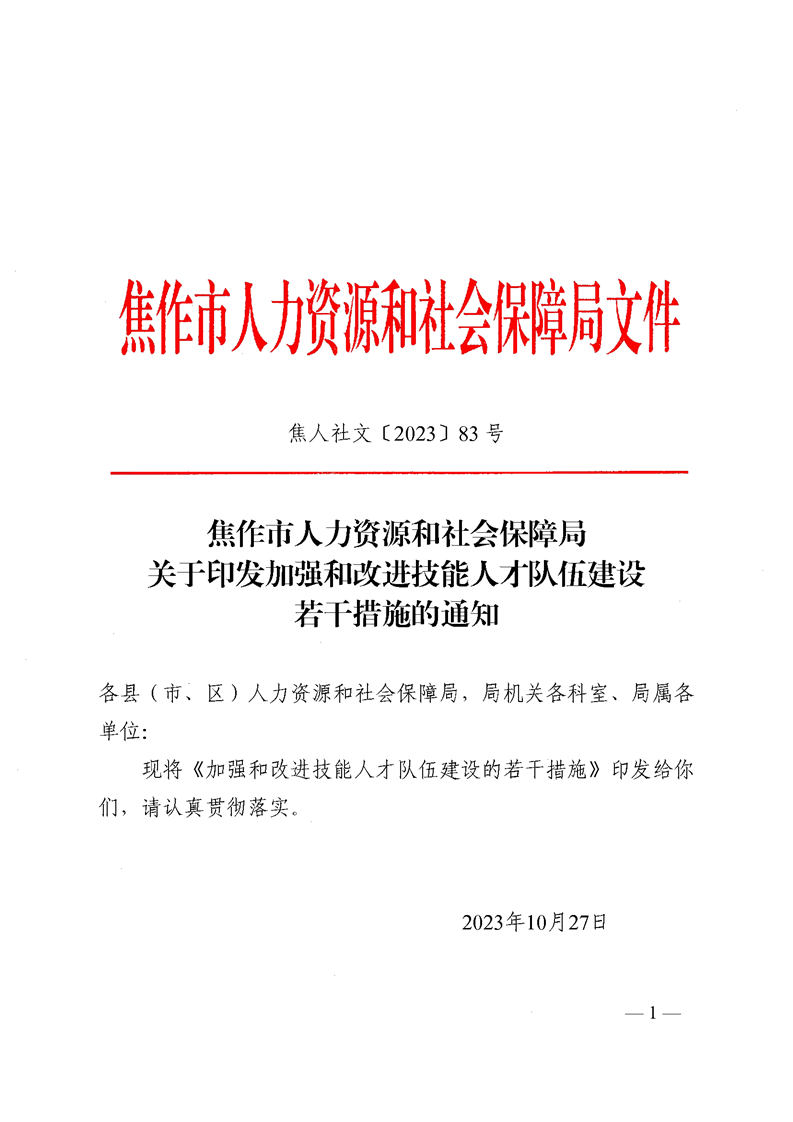 焦作市人力资源和社会保障局关于印发加强和改进技能人才队伍建设若干措施的通知