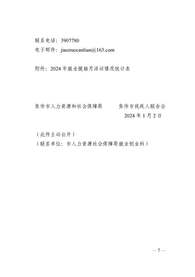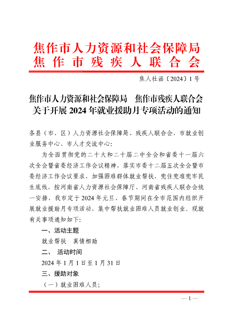 焦作市人力资源和社会保障局 焦作市残疾人联合会关于开展2024年就业援助月专项活动的通知