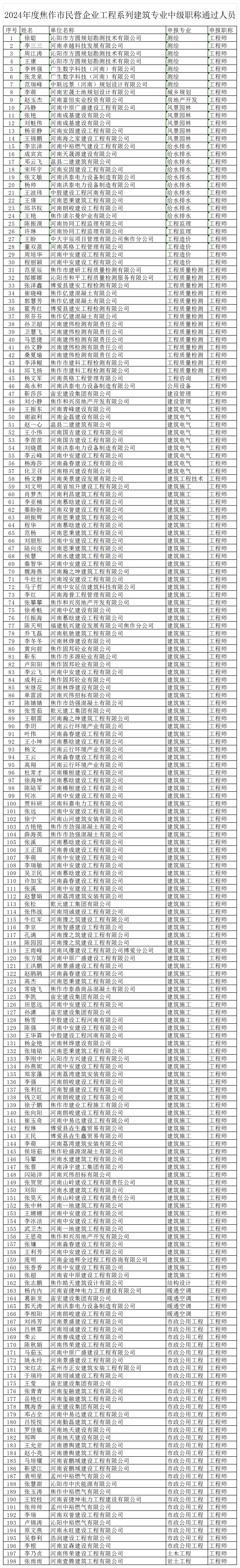 根据全市职称工作安排,通过个人申报、单位推荐、主管部门资格审查、评委会承办部门复核,经焦作市民营企业工程系列建筑专业评审委员会组织专家评审,有198名同志通过评审。现将评审通过人员公示如下,请予监督。如对公示人员有问题反映,请于公示期以书面形式反馈我们。 公示时间:2024年9月23日-10月23日 邮寄地址:焦作市人社大厦607房间 邮政编码:454000 联系方式:焦作市人力资源和社会保障局专技科 0391-2118928