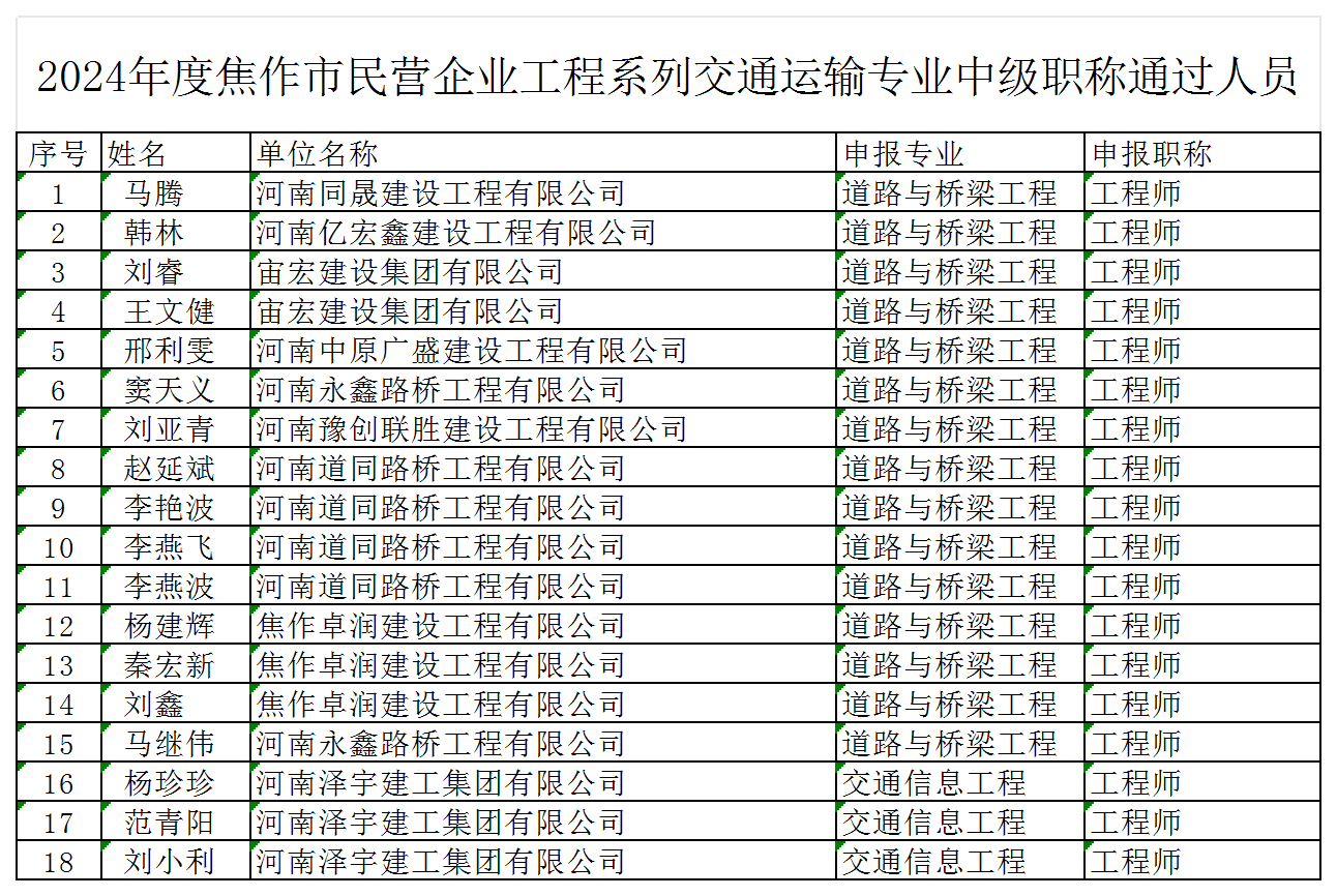 根据全市职称工作安排,通过个人申报、单位推荐、主管部门资格审查、评委会承办部门复核,经焦作市民营企业工程系列交通运输专业评审委员会组织专家评审,有18名同志通过评审。现将评审通过人员公示如下,请予监督。如对公示人员有问题反映,请于公示期以书面形式反馈我们。 公示时间:2024年9月23日-10月23日 邮寄地址:焦作市人社大厦607房间 邮政编码:454000 联系方式:焦作市人力资源和社会保障局专技科 0391-2118928