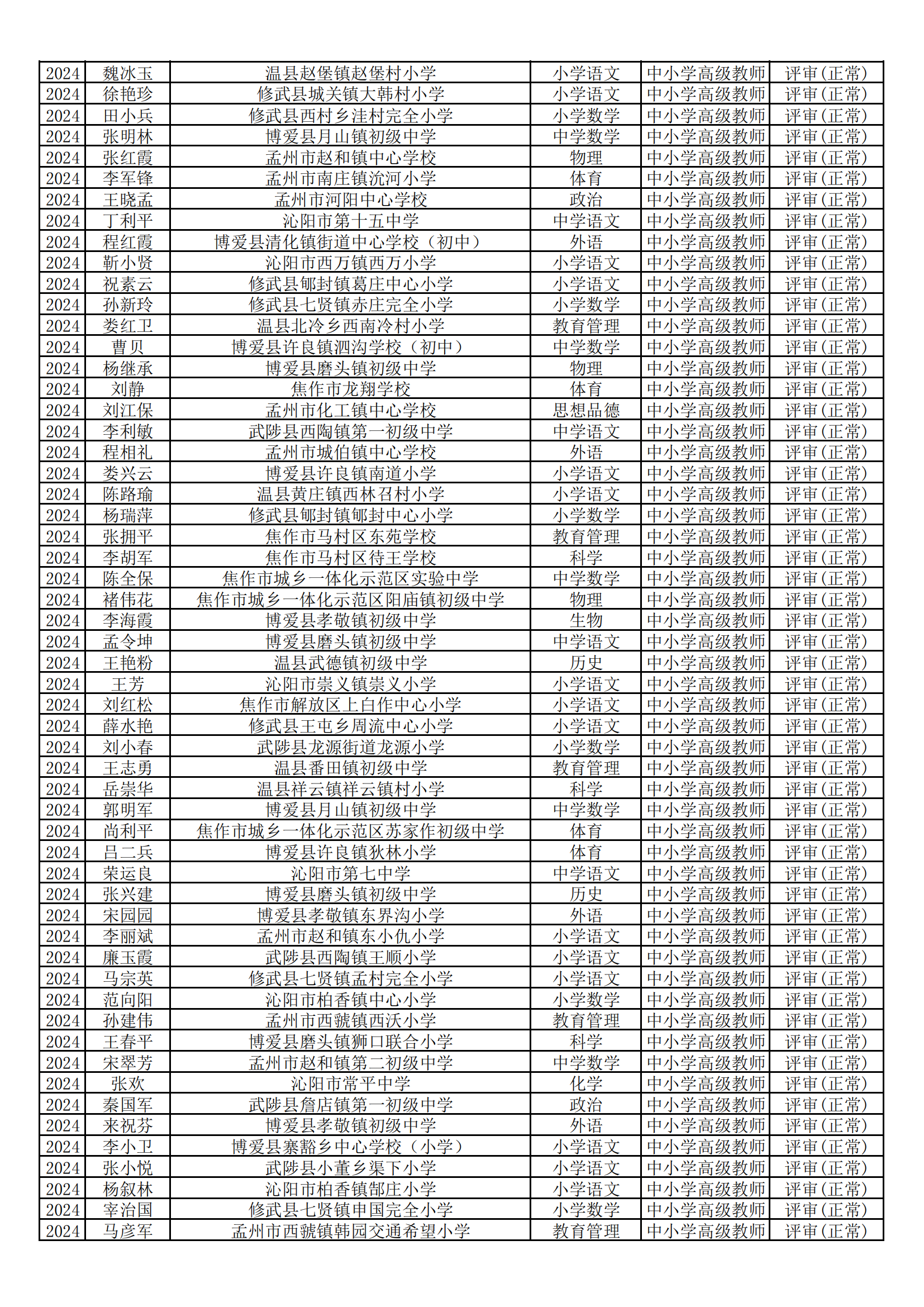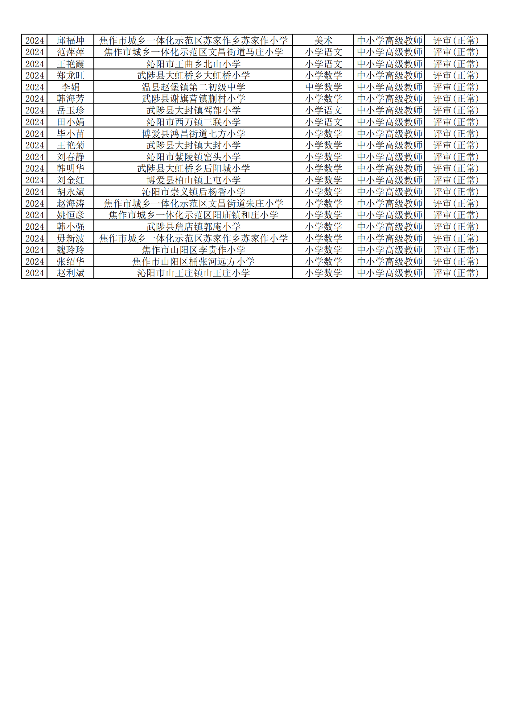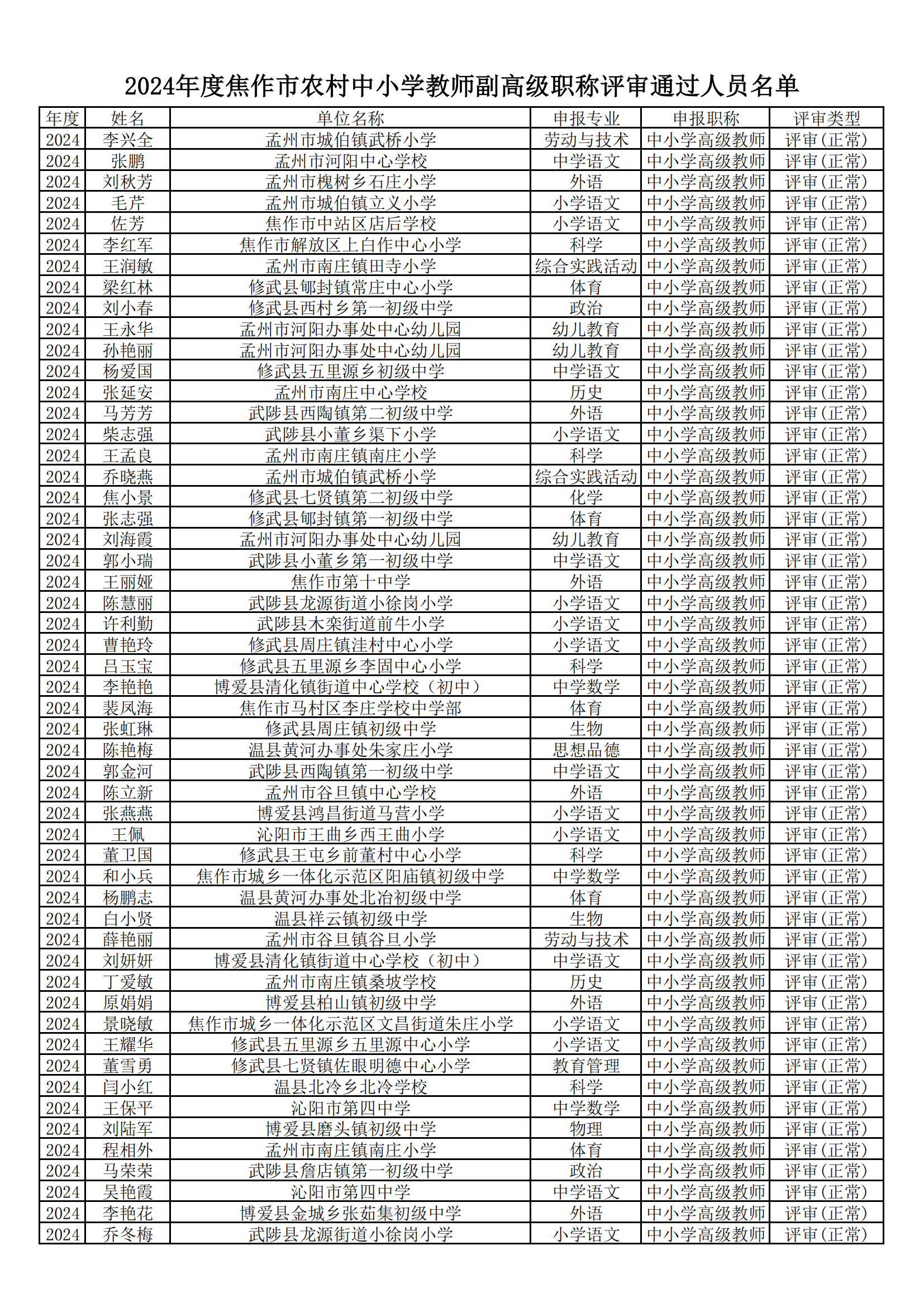 根据全市职称工作安排,通过个人申报、单位推荐、主管部门资格审查、评委会承办部门复核,经焦作市农村中小学教师副高级职称评审委员会组织讲课答辩和专家评审,354名同志通过评审。现将评审通过人员公示如下,请予监督。如对公示人员有问题反映,请于公示期以书面形式反馈我们。 公示时间:2024年11月19日-12月19日 邮寄地址:焦作市人社大厦606房间 邮政编码:454000 联系方式:焦作市人力资源和社会保障局专技科 2118928 焦作市教育局人事科 2992831