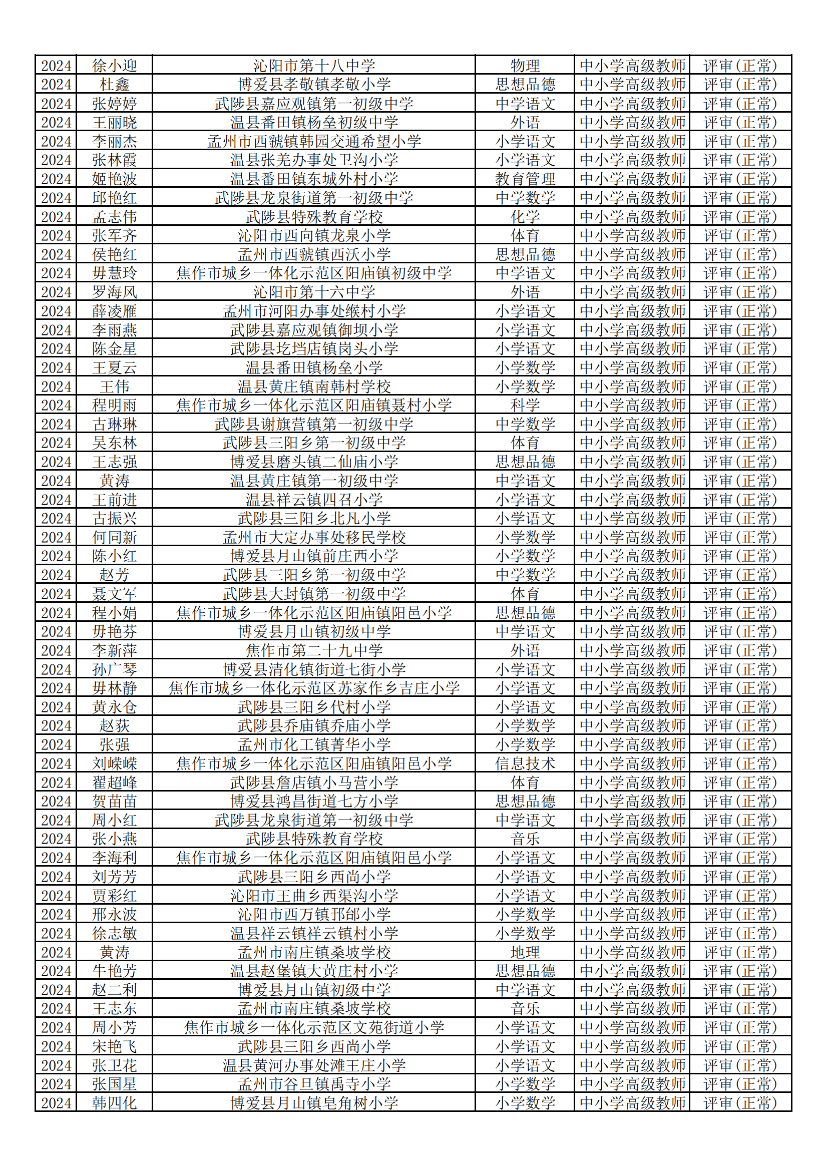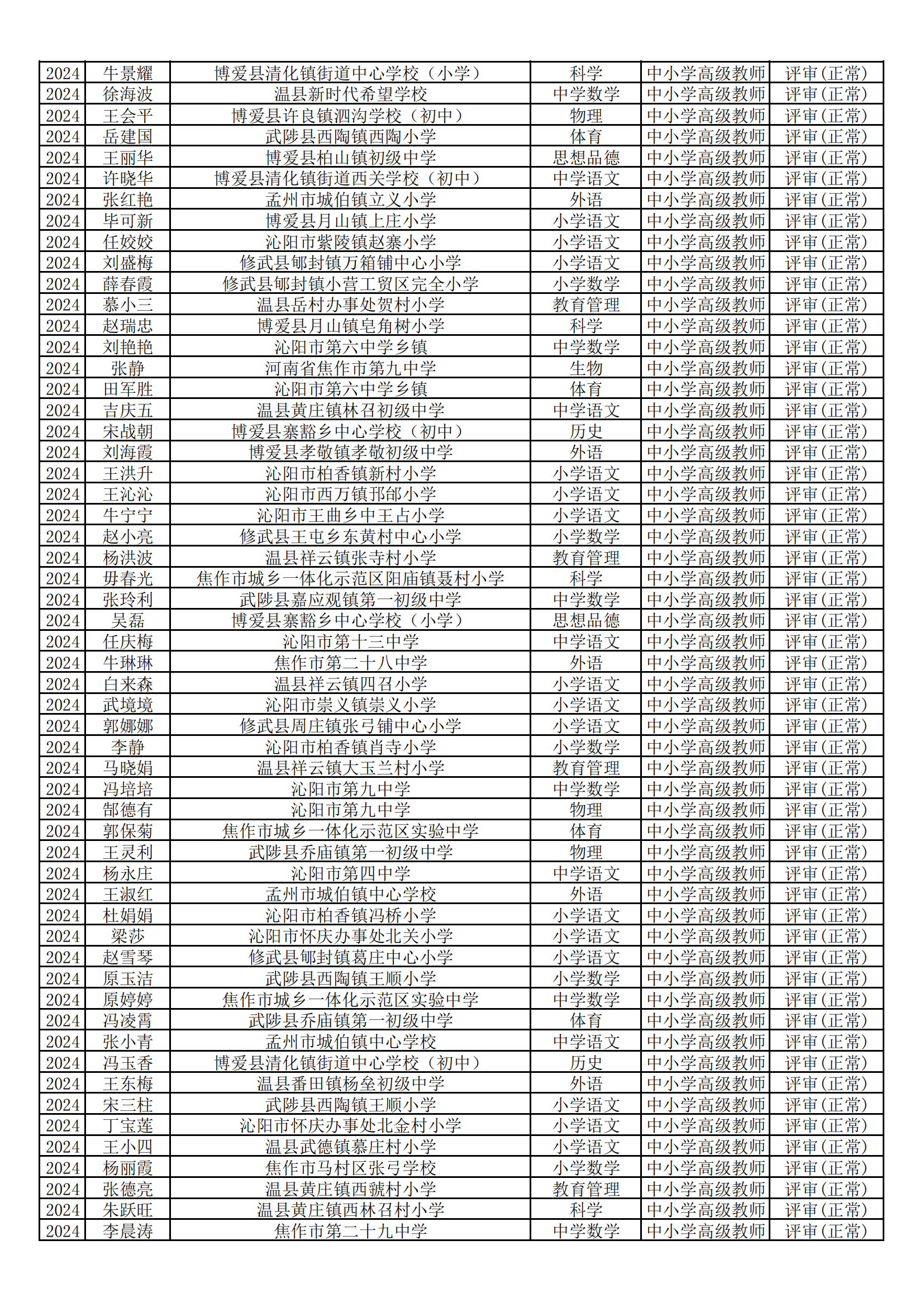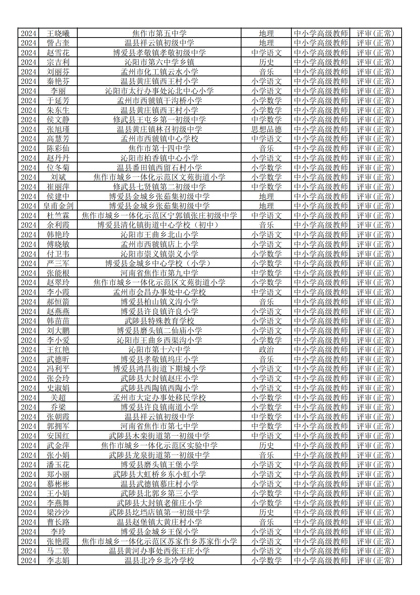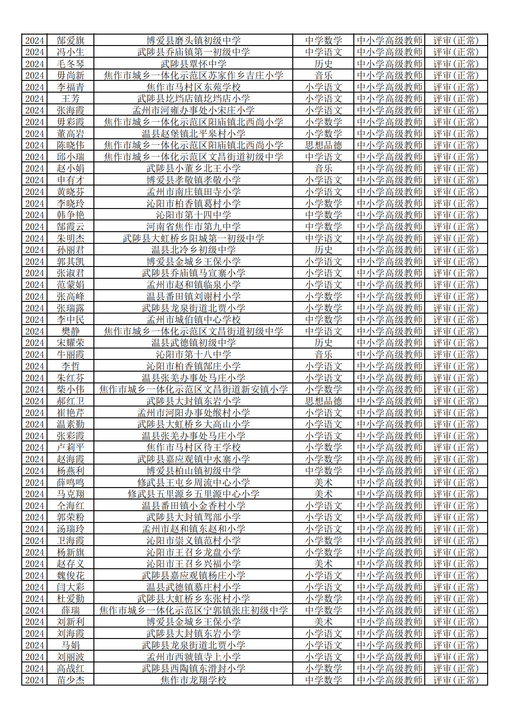 根据全市职称工作安排,通过个人申报、单位推荐、主管部门资格审查、评委会承办部门复核,经焦作市农村中小学教师副高级职称评审委员会组织讲课答辩和专家评审,354名同志通过评审。现将评审通过人员公示如下,请予监督。如对公示人员有问题反映,请于公示期以书面形式反馈我们。 公示时间:2024年11月19日-12月19日 邮寄地址:焦作市人社大厦606房间 邮政编码:454000 联系方式:焦作市人力资源和社会保障局专技科 2118928 焦作市教育局人事科 2992831