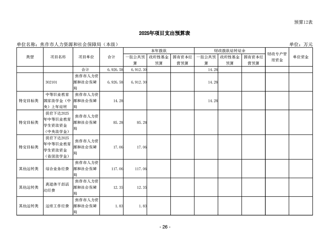 焦作市人力资源和社会保障局(本级)2025年度单位预算